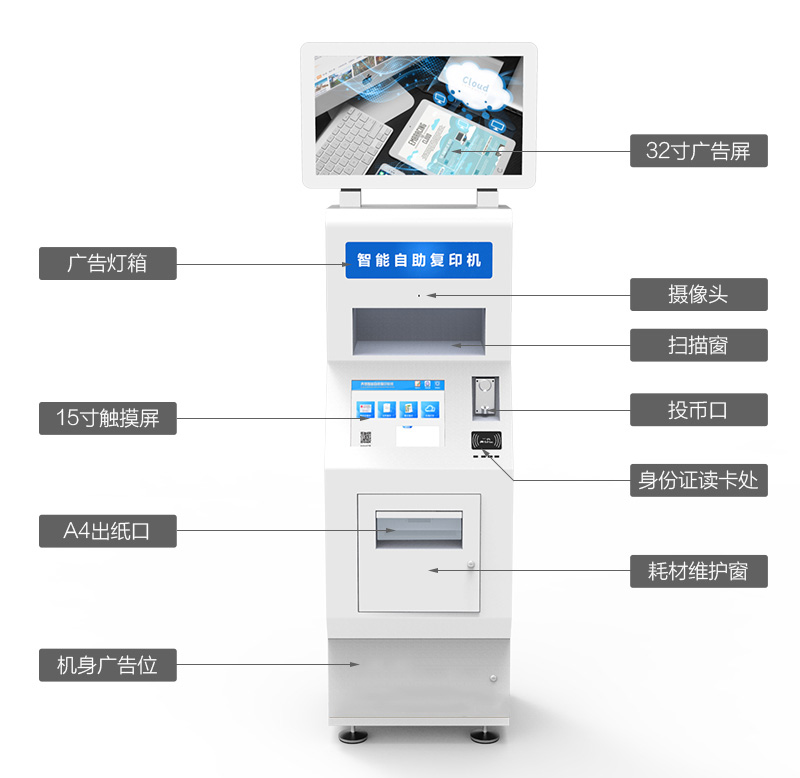 ? ? ? 自助復(fù)印打印終端可以進(jìn)行文件掃描、U盤打印、身份證復(fù)印、文件復(fù)印,擁有微信、支付寶、銀聯(lián)、現(xiàn)金多種支付方式,并且靈活的部署在商場(chǎng)、購(gòu)物中心、銀行、辦事大廳等人流密集地,實(shí)現(xiàn)無(wú)人值守且操作簡(jiǎn)單,使人們?cè)谛枰蛴r(shí)能夠及時(shí)提供打印服務(wù)。