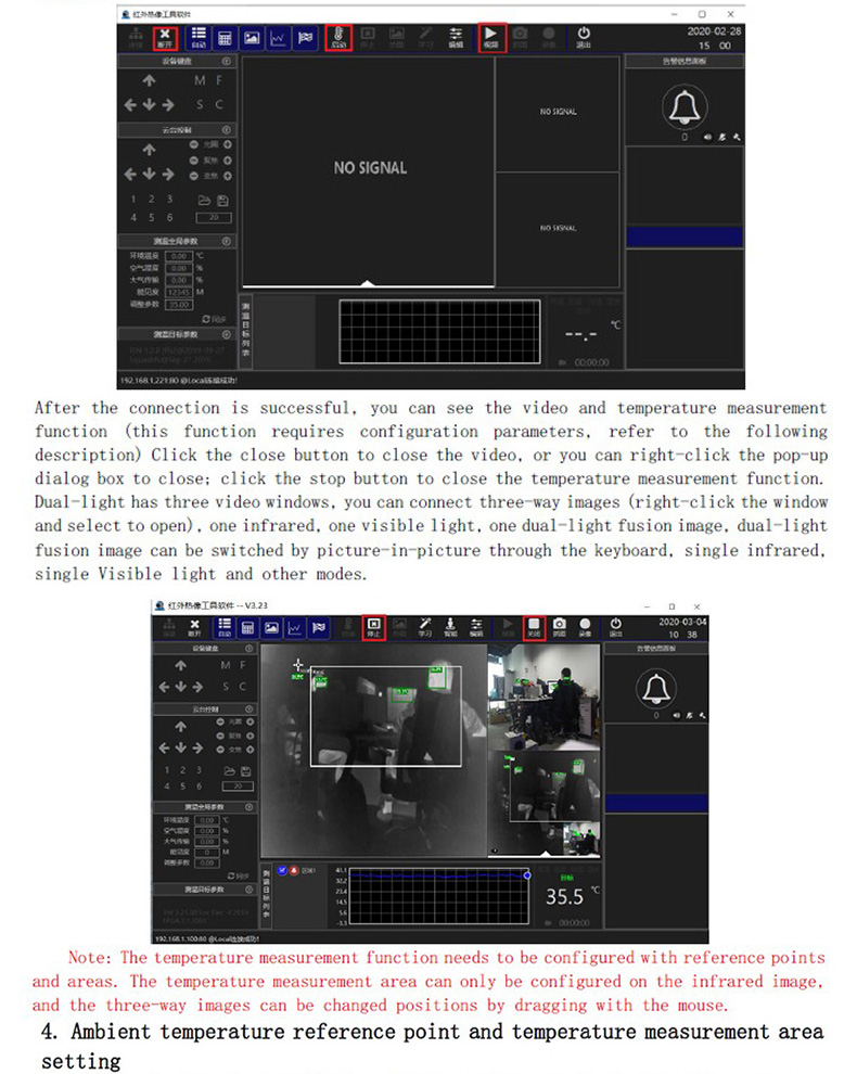 ??? 雙光模組通過網(wǎng)絡圖傳連接PC,PC端安裝測溫軟件,該軟件可以連接熱像和可見光視頻,可以設置點和區(qū)域測溫,區(qū)域內(nèi)可自動追蹤人員并顯示溫度,可配置超溫報警,實現(xiàn)報警抓拍功能。
