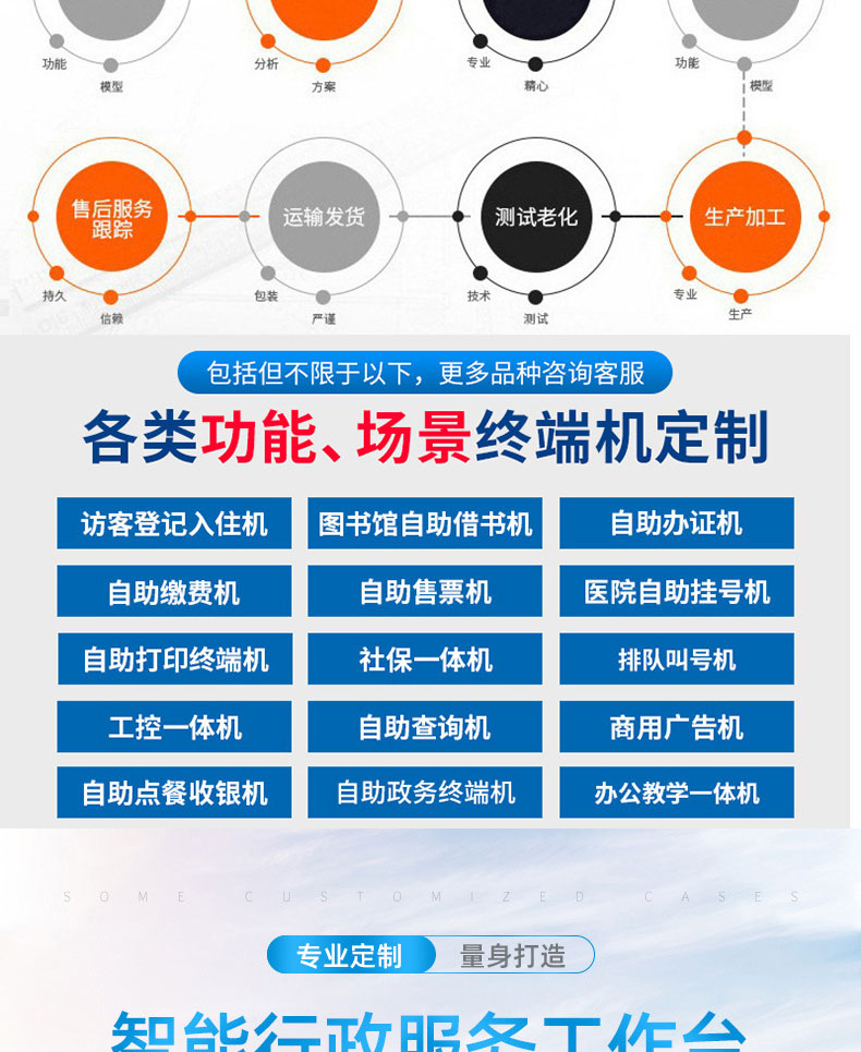 自助終端機定制:定制各種場景各種款式非標終端機;例如訪客機、景區(qū)自助取票機、醫(yī)院繳費查詢機、醫(yī)院自助取單機、社保查詢機、室內(nèi)外廣告機、排隊叫號機、工控一體機、電力繳費查詢機、圖書自助銷售機、便攜式計算機、酒店自助入住機、自助收銀機等終端。