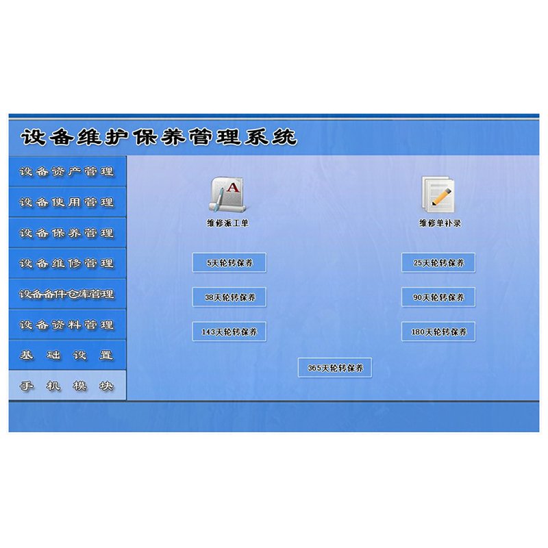 3、設(shè)備保養(yǎng)管理: 包括設(shè)備保養(yǎng)計(jì)劃、保養(yǎng)信息、歷史保養(yǎng)清單、5天輪轉(zhuǎn)保養(yǎng)、25天輪轉(zhuǎn)保養(yǎng)、38天輪轉(zhuǎn)保養(yǎng)、90天輪轉(zhuǎn)保養(yǎng)、143天輪轉(zhuǎn)保養(yǎng)、末次保養(yǎng)記錄等。設(shè)置首次保養(yǎng)時(shí)間,軟件將自動(dòng)輪轉(zhuǎn)提醒保養(yǎng)。