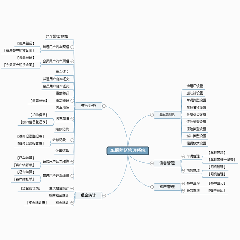 基本信息:修理廠設置、加油站設置、車輛類型設置、車輛名稱設置、會員類型設置、證件類型設置、保險類型設置、燃油類型設置、租賃模式設置;
