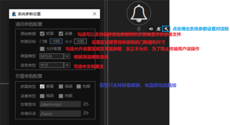點擊告警信息面板中的設置圖標,如下圖藍框內(nèi),彈出系統(tǒng)參數(shù)設置對話框,如圖目標用于設置抓取高溫目標的門限和大小,對于人體測溫檢測目標一般選190,可以上下小范圍調整,越小越靈敏,大小表示自動抓取高溫目標的大小,100表示100個像數(shù)的大?。ㄈ?span>10x10,5x20都是100像數(shù)),可以通過設置大小過濾小目標,根據(jù)場景監(jiān)控距離設置。