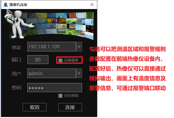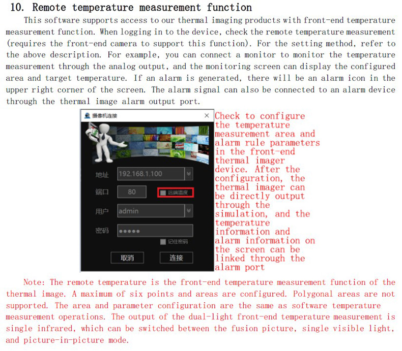 本軟件支持接入具有前端測溫功能的我司熱像產(chǎn)品,登入設備的時候勾選遠端測溫即可(需要前端熱像儀支持此功能),設置方法參考上面說明,配置成功后熱像可以通過模擬輸出連接監(jiān)視器監(jiān)控測溫,監(jiān)控畫面可顯示配置的區(qū)域及目標溫度。產(chǎn)生告警,畫面右上角會有報警圖標,報警信號也可以通過熱像報警輸出口外接報警設備。
