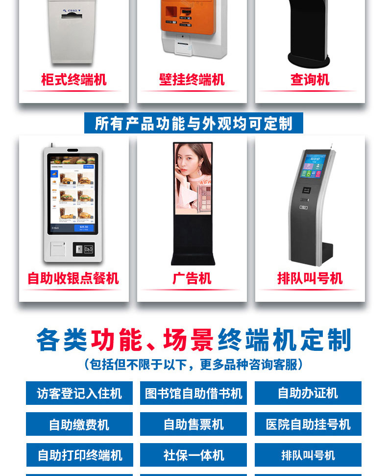 自助終端機(jī)定制:定制各種場(chǎng)景各種款式非標(biāo)終端機(jī);例如訪客機(jī)、景區(qū)自助取票機(jī)、醫(yī)院繳費(fèi)查詢機(jī)、醫(yī)院自助取單機(jī)、社保查詢機(jī)、室內(nèi)外廣告機(jī)、排隊(duì)叫號(hào)機(jī)、工控一體機(jī)、電力繳費(fèi)查詢機(jī)、圖書自助銷售機(jī)、便攜式計(jì)算機(jī)、酒店自助入住機(jī)、自助收銀機(jī)等終端。