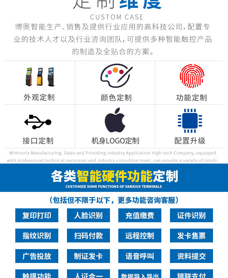 深圳市博奧智能科技有限公司專業(yè)提供自助終端機、觸摸查詢一體機、廣告機、液晶顯示器等產(chǎn)品的硬件、軟件研發(fā)與設計加工OEM/ODM等一站式服務;我們一直秉承以產(chǎn)品質(zhì)量為核心、客戶至上、服務共贏為宗旨,為金融、醫(yī)療、教育、人工智能、政府工程項目、智慧城市、軌道交通、商業(yè)自助服務、廣告?zhèn)髅降刃袠I(yè)提供質(zhì)量過硬的產(chǎn)品和優(yōu)質(zhì)的服務。