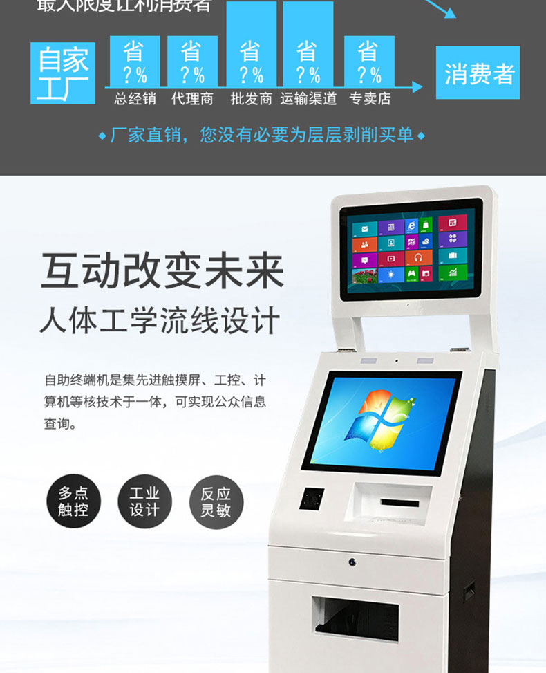 專業(yè)提供電腦觸控產(chǎn)品、自助服務(wù)終端的設(shè)計(jì)及生產(chǎn)服務(wù),主要產(chǎn)品自助終端機(jī)、自助打印機(jī)、自助取票機(jī)、自助查詢機(jī)、自助繳費(fèi)機(jī)、自助發(fā)卡機(jī)、自助政務(wù)一體機(jī),產(chǎn)品使用于各個(gè)行業(yè);醫(yī)院、學(xué)校、銀行、酒店、景區(qū)等。。。。。公司擁有專業(yè)的生產(chǎn)線,嚴(yán)格的質(zhì)量把控。耐心的咨詢服務(wù)團(tuán)隊(duì)及專業(yè)的技術(shù)負(fù)責(zé)團(tuán)體。