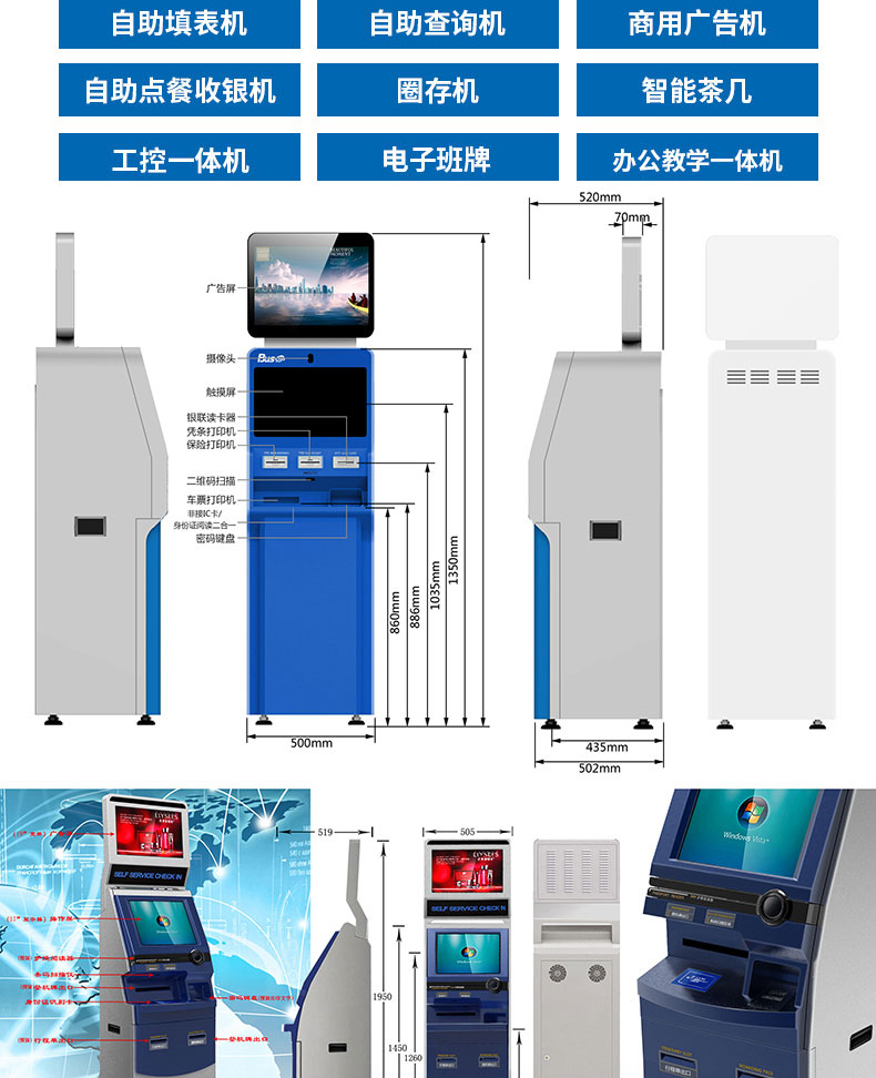 定制實(shí)用的自助終端設(shè)備,我們是專業(yè)。多種定制款式任意選擇,可根據(jù)需求定制外觀屏幕尺寸可選,配件數(shù)量可選,主機(jī)配置可選。