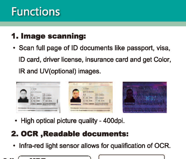 ? Scan full page of ID documents like passport, visa, ID card, driver license, insurance card and get Color, IR and UV(optional) images